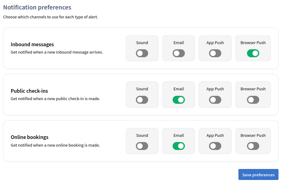 You can now receive notifications of new inbound SMS, new reservations, and new walk-ins via email, audio alerts, and browser and app push notifications.